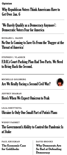 A fair amount has been written about the negative tone of most news coverage, especially at the New York Times. Yet the series of opinion headlines that appeared in the January 7 Times, one right after the other, struck me as almost a caricature. Look at these. If you were engineering a series of headlines to make the Times’ largely Democratic readers reach for a bottle of Xanax, could you do any better?